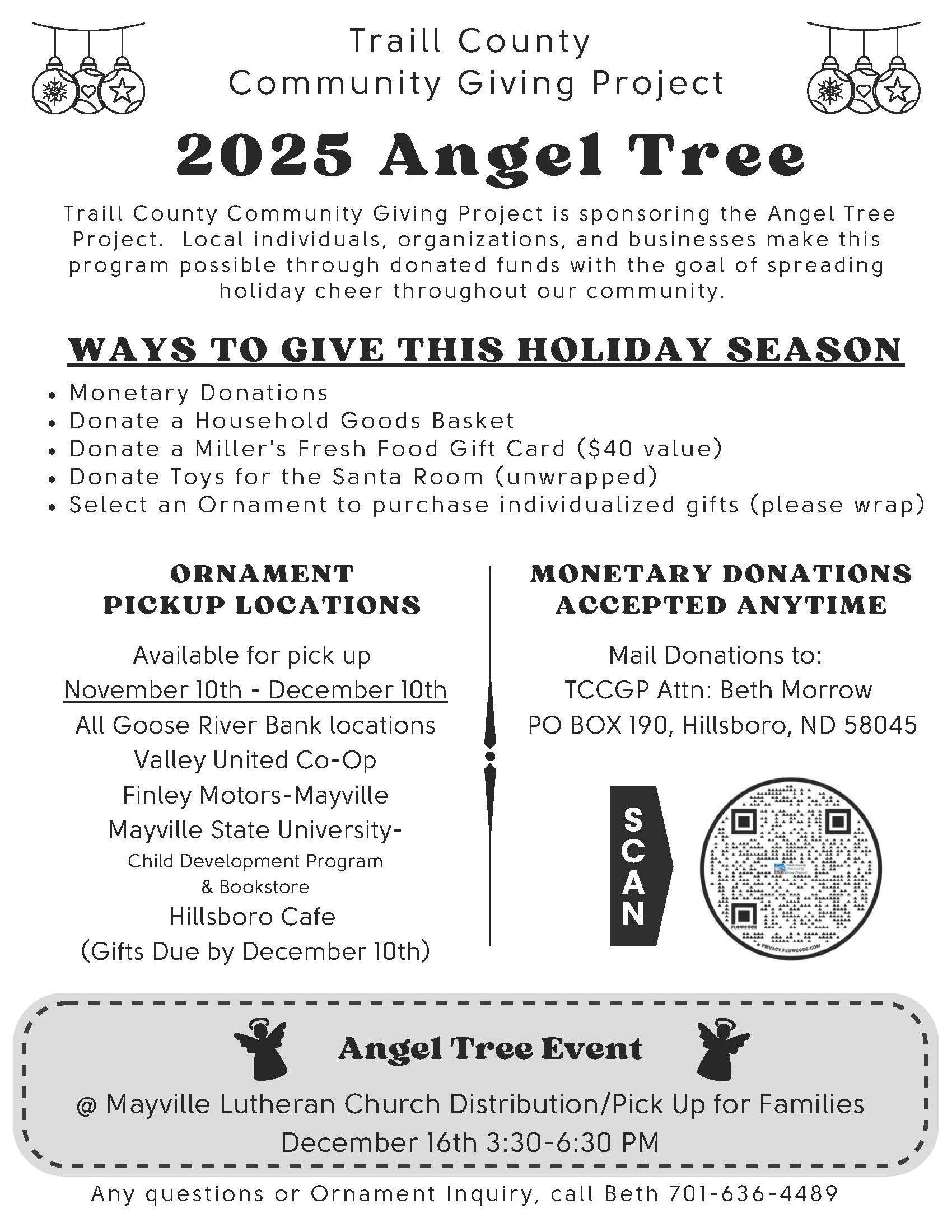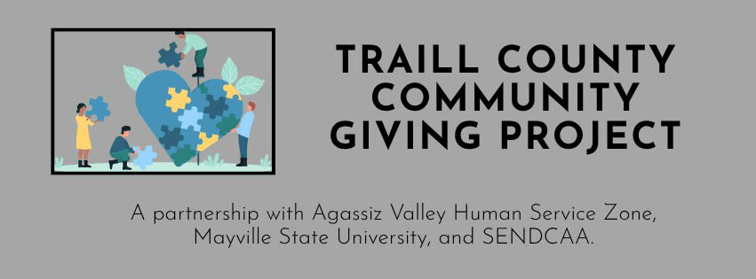 Traill County Community Giving Projects (TCCGP) is a charitable organization that strives to improve the quality of life for local children, families, elderly, and disabled through charitable giving, specialized projects, and emergency services. The group is a collaboration between SENDCAA, Agassiz Valley Social Services, and MSU Child Development Programs and also include various community members.